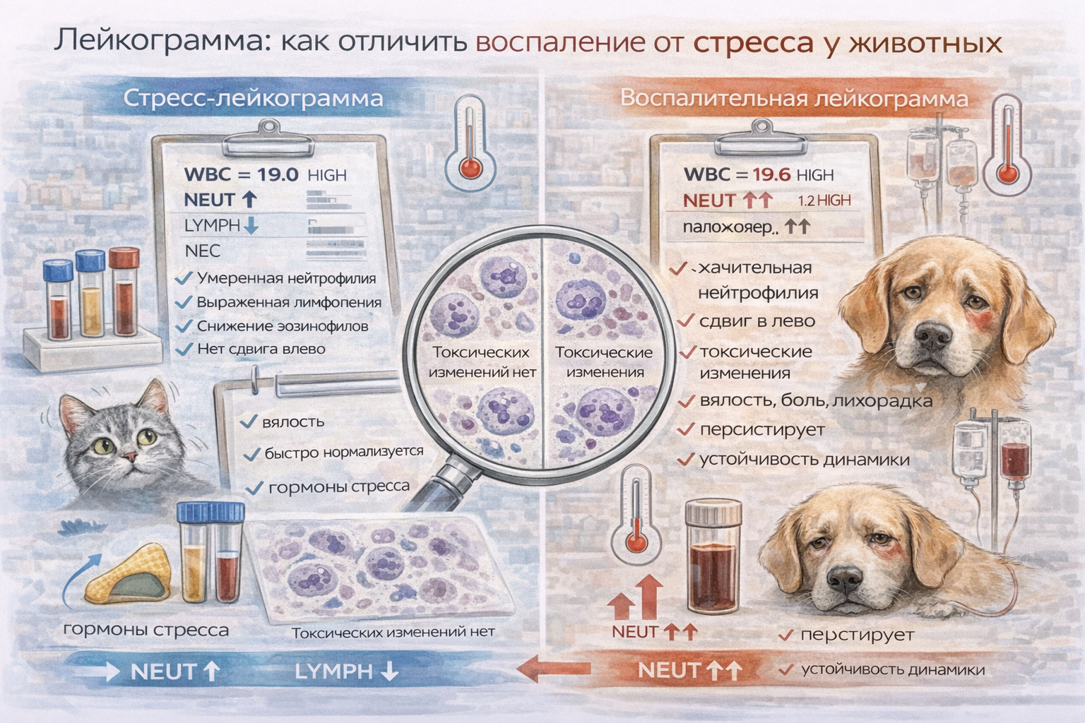 Лейкограмма — один из самых полезных инструментов ОАК, но интерпретация требует понимания различий между стрессовой и воспалительной реакцией. Стресс чаще даёт нейтрофилию с лимфопенией и эозинопенией без выраженного сдвига влево. Воспаление чаще сопровождается сдвигом влево и токсическими изменениями нейтрофилов. При сомнениях мазок крови и динамическое наблюдение помогают принять правильное решение.